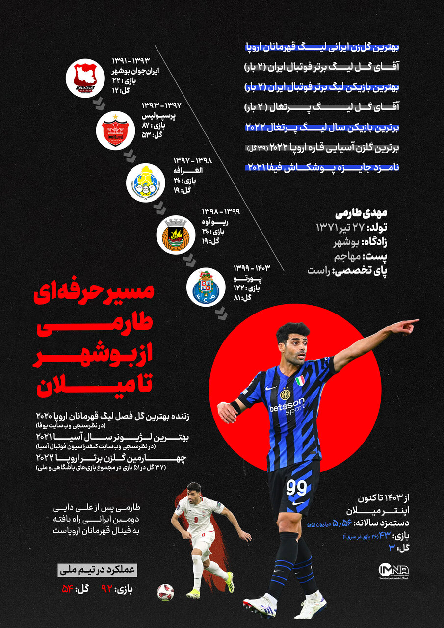 بوشهری ها /طارمی ستاره بوشهری فوتبال ایران با عبور از مسیرهای پرفراز و نشیب از زمینهای خاکی جنوب کشور تا لیگ پرتغال و درخشش در پورتو، حالا به تیم پر افتخار اینتر میلان ایتالیا رسیده است؛ داستان مهاجمی که هرگز از رویاهایش دست نکشید و حالا نامش در قلب فوتبال اروپا طنینانداز شده است.