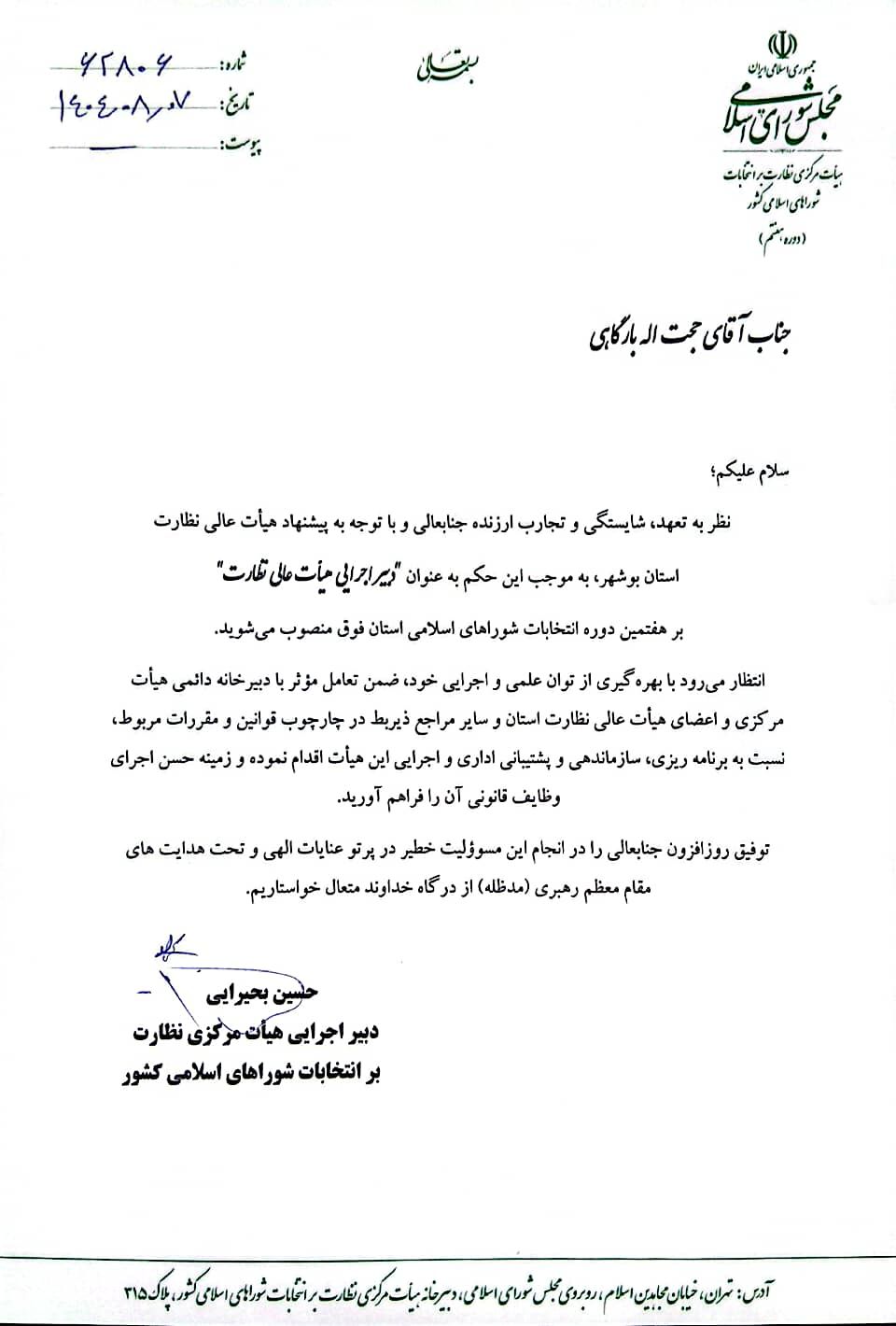 بوشهری ها /طی حکمی از سوی دبیر اجرایی هیات مرکزی نظارت بر انتخابات شوراهای اسلامی کشور، «حجت الله بارگاهی» جوان دشتستانی به عنوان دبیر اجرایی هیات عالی نظارت بر هفتمین دوره انتخابات شوراهای اسلامی استان بوشهر منصوب شد.